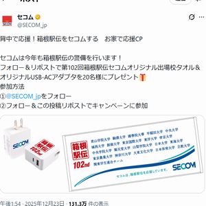 箱根駅伝セコムオリジナル出場校タオル 他 この懸賞に応募 お気に入り #X懸賞(Twitter懸賞) #シニア向け #タオル #主婦向け #女性向け #生活雑貨 #男性向け 生活雑貨> タオル> 懸賞の詳細 セコムは今年も箱根駅伝の警備を行います! フォロー&リポストで第102回箱根駅伝セコムオリジナル出場校タオル&オリジナルUSB-ACアダプタを20名様にプレゼント! フォロー&リポストするだけで応募完了。
